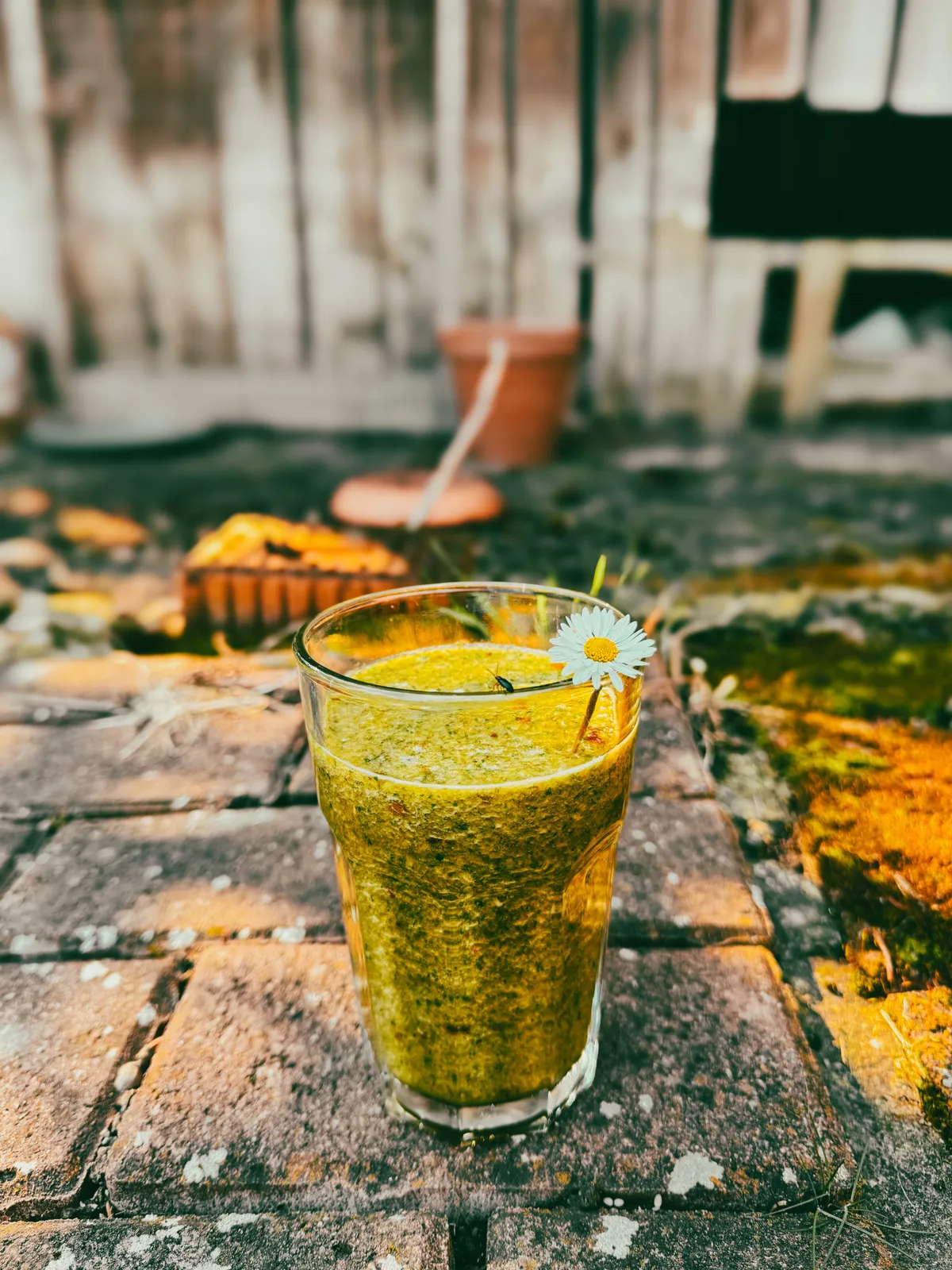 Und dann der Green Smoothie. Löwenzahn, Giersch, Spinat, Salat, Birne, Apfel. Die ersten beiden sind eigentlich Unkraut — oder eben nicht, je nachdem wie man schaut. Sie tauchen einfach auf, ungefragt, zuverlässig, essbar. Giersch zum Beispiel ist kaum aufzuhalten. Das kann man bekämpfen oder man trinkt ihn.