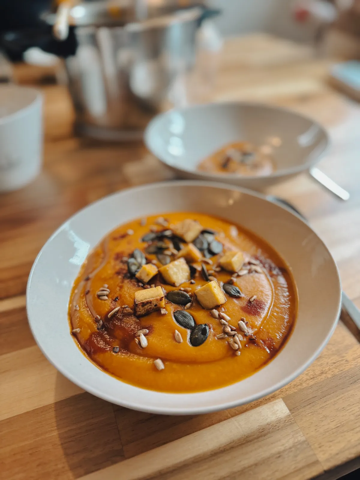 Da liegt er noch, der Kürbis vom letzten Herbst. Er sieht aus als wäre er gerade erst geerntet worden. Zusammen mit Zwiebeln, Karotten und Kartoffeln wird er zur Suppe — gelborange, warm, nach wie vor tröstlich. Es ist faszinierend, dass ein Gemüse aus dem September im März noch auf dem Tisch landen kann, einfach weil man es dunkel und kühl aufbewahrt hat.