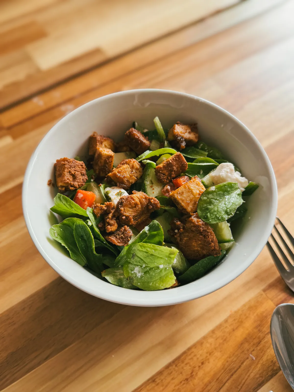 Für den Gartensalat gibt es gerade Nüsschen — das Zeug wächst hartnäckig und verlässlich, wenn vieles andere noch schläft. Mit gebratenem Tofu, Champignons, veganem Feta, Gurke und Tomate wird daraus etwas, das köstlich frisch schmeckt und schon jetzt Lust auf den Sommer macht.